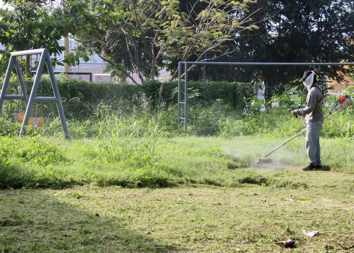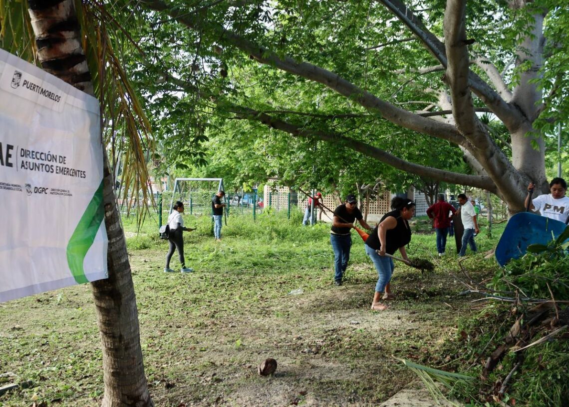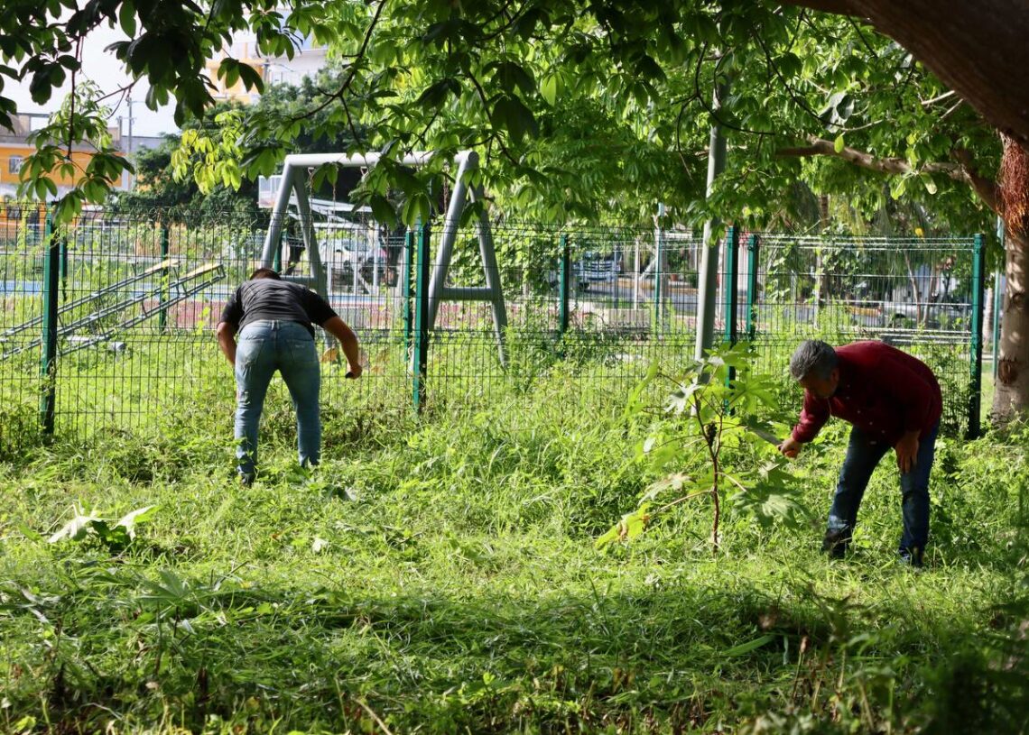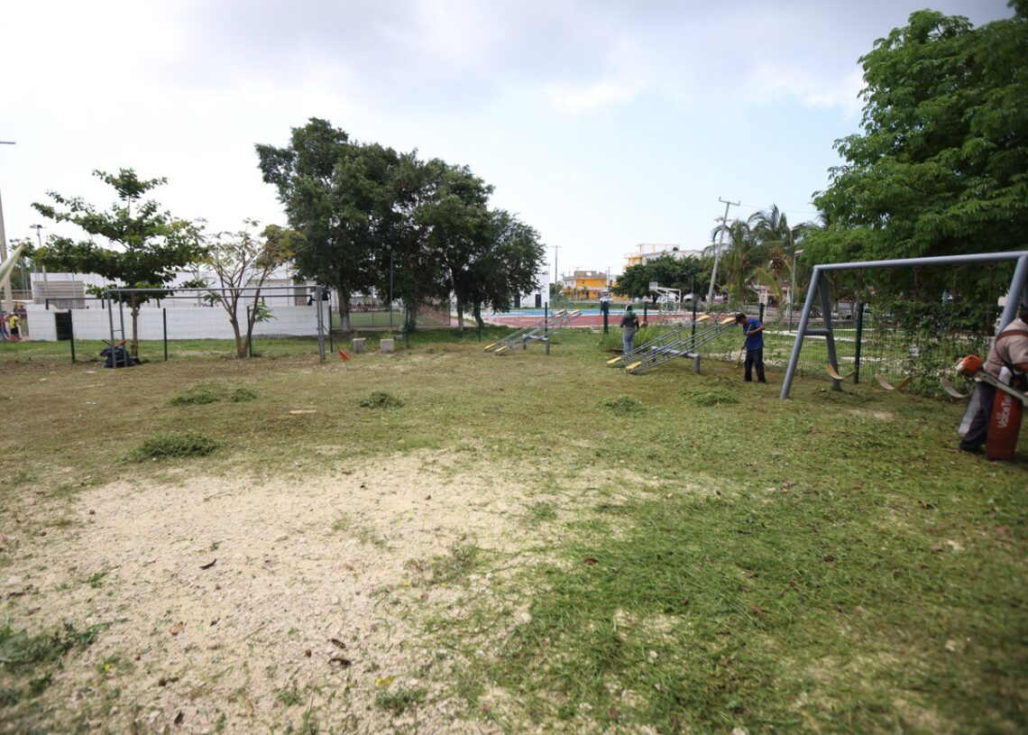 Puerto Morelos, Quintana Roo, 10 de junio de 2023.- En respuesta inmediata a una demanda ciudadana, el gobierno de la presidenta municipal Blanca Merari Tziu Muñoz organizó una jornada de limpieza y mantenimiento en el área de juegos infantiles de la Unidad Deportiva de la colonia Pescadores.