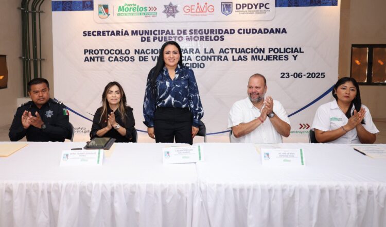 Puerto Morelos, Quintana Roo, 23 de junio de 2025.— Al poner en marcha el Curso-Taller relativo al Protocolo Nacional para la Actuación Policial ante Casos de Violencia contra las Mujeres y Feminicidio y el Protocolo Nacional de Coordinación Interinstitucional para Protección de Niñas, Niños y Adolescentes Víctimas de Violencia, la presidenta municipal Blanca Merari Tziu Muñoz aseguró que reforzar la capacitación de funcionarias y funcionarios en esos rubros es un compromiso firme de su administración.