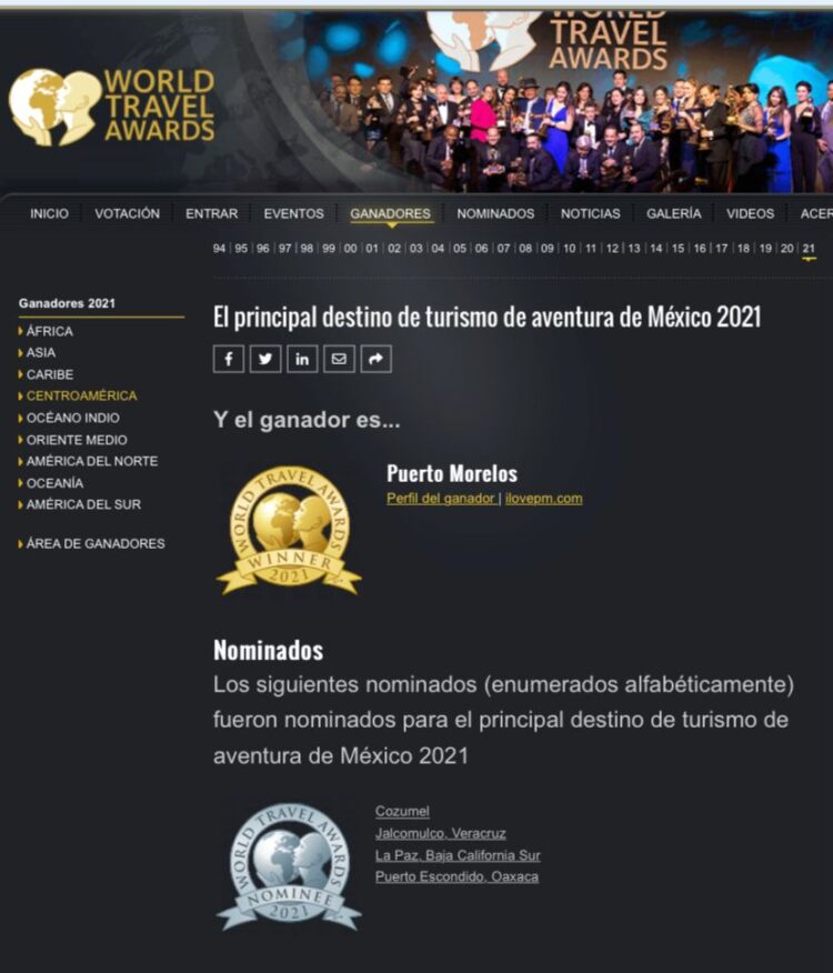 Puerto Morelos, Quintana Roo, 22 de octubre de 2021.- Puerto Morelos fue elegido por tercer año consecutivo como el mejor Destino de Aventura de México, en los World Travel Awards (WTA) 2021, reconocimiento que se otorga a la excelencia de la industria de viajes y turismo.