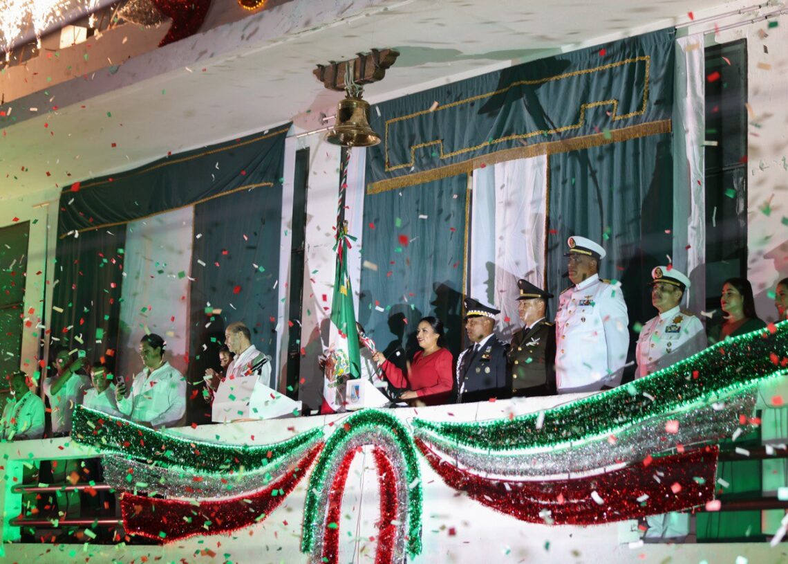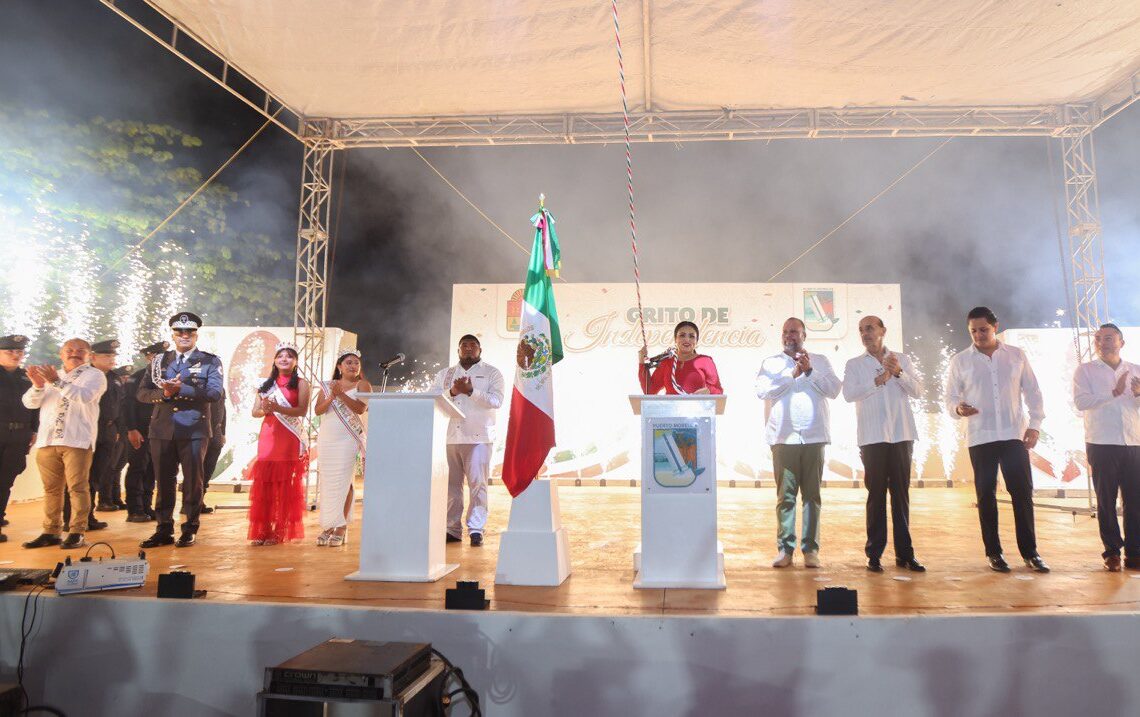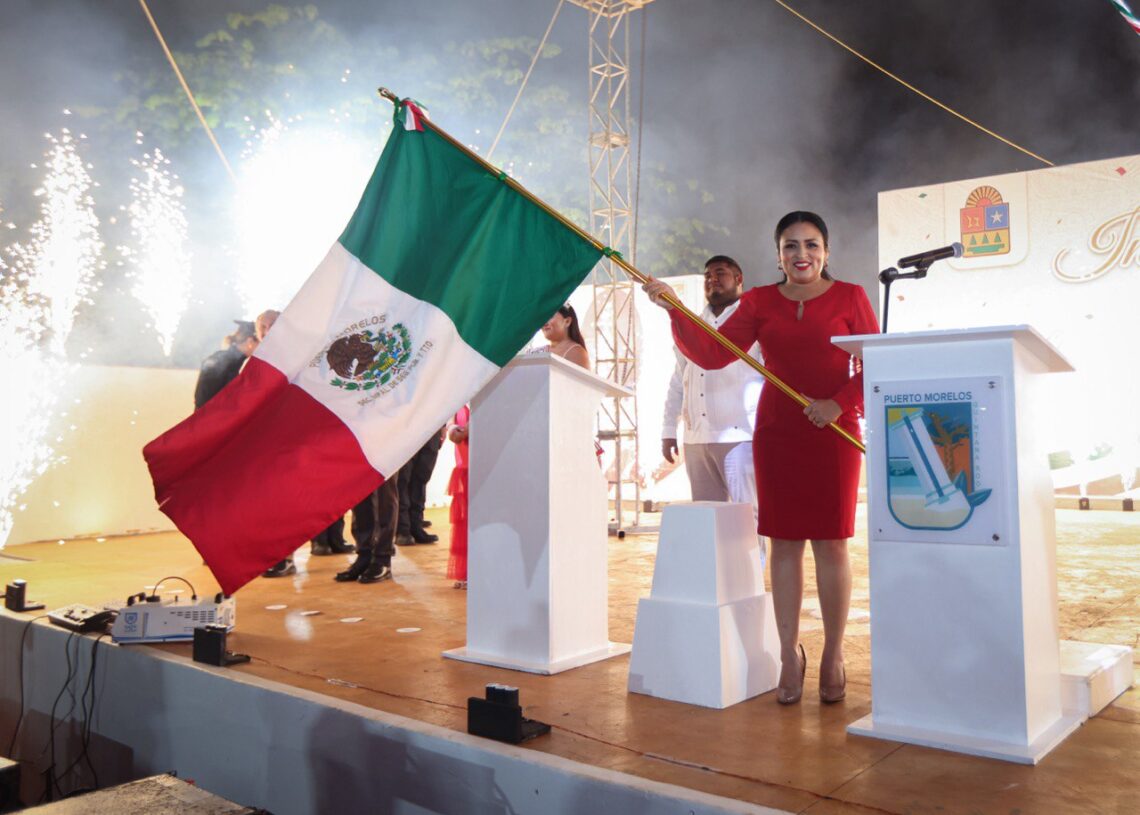Puerto Morelos, Quintana Roo, 15 de septiembre de 2024.- La presidenta municipal Blanca Merari Tziu Muñoz encabezó esta noche la tradicional ceremonia del Grito de Independencia, que reunió a cientos de portomorelenses para disfrutar de una velada llena de fervor patrio frente a la sede del gobierno local, ubicada en la avenida Joaquín Zetina Gasca.