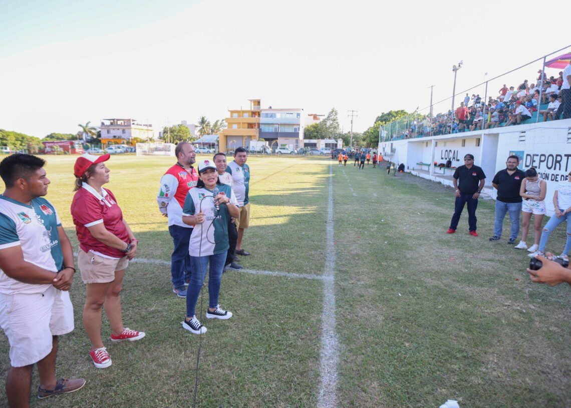 Puerto Morelos, Quintana Roo, 16 de septiembre de 2023.- La presidenta municipal Blanca Merari Tziu Muñoz deseó todo el éxito al equipo Zorros Puerto Morelos, que esta tarde hizo su debut triunfal frente a Campeche F. C. nueva Generación dos goles a cero, en la Tercera División del Futbol Mexicano, en duelo disputado en el campo de la Unidad Deportiva Pescadores que lució un lleno total.