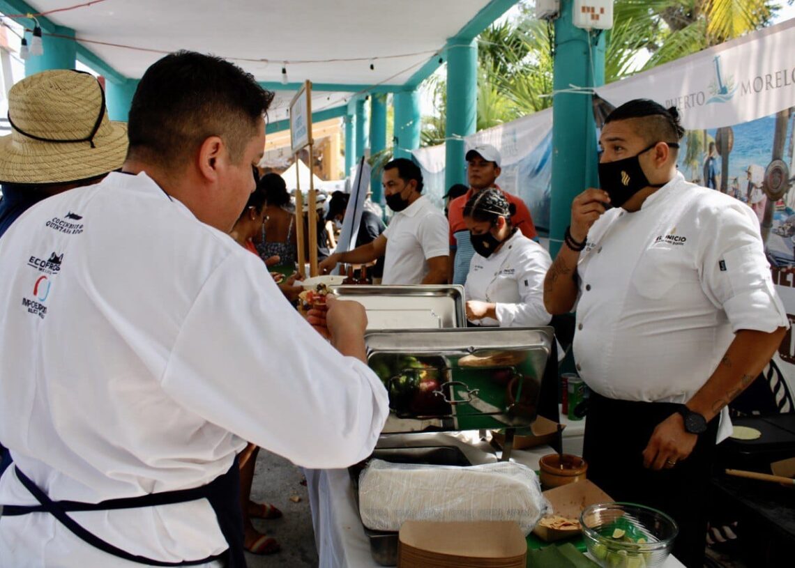 Puerto Juárez, Benito Juárez, 25 de junio de 2022.- En el segundo día y de conclusión del primer Festival Gastronómico del Caribe, Puerto Morelos se distinguió por la preparación de platillos exclusivamente elaborados de la cosecha de productores de Leona Vicario, con sus taquitos de tilapia en pibil y una tostada de ceviche con esta misma proteína, acompañada de frutos rojos, pepino y miel de la misma comunidad.