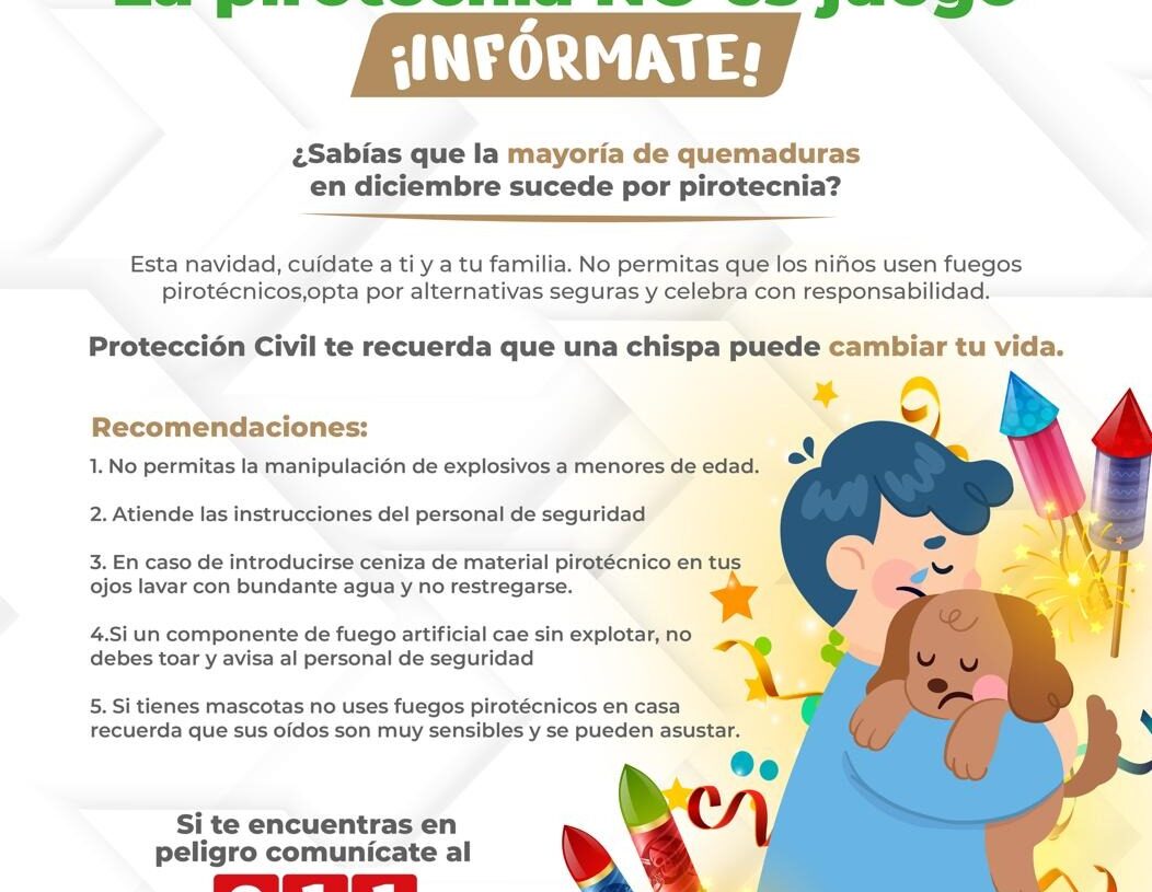 En este contexto, el gobierno municipal lanzó la campaña “La pirotecnia no es un juego”, con la que se busca concientizar sobre los riesgos asociados al uso de fuegos artificiales. Protección Civil recuerda que la mayoría de las quemaduras que se registran en diciembre están relacionadas con la pirotecnia y advierte que una chispa puede cambiar la vida de una persona, por lo que invita a cuidar de las familias y evitar que niñas y niños manipulen estos productos, promoviendo celebraciones seguras y responsables.