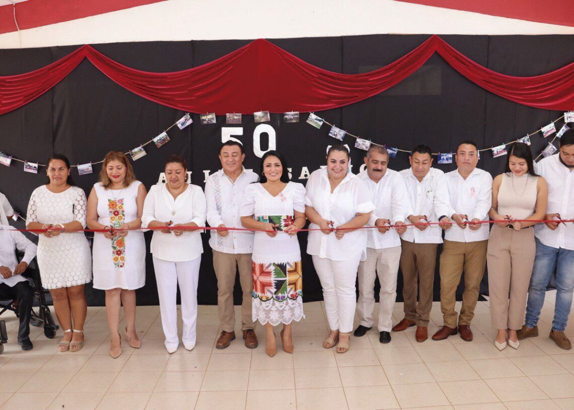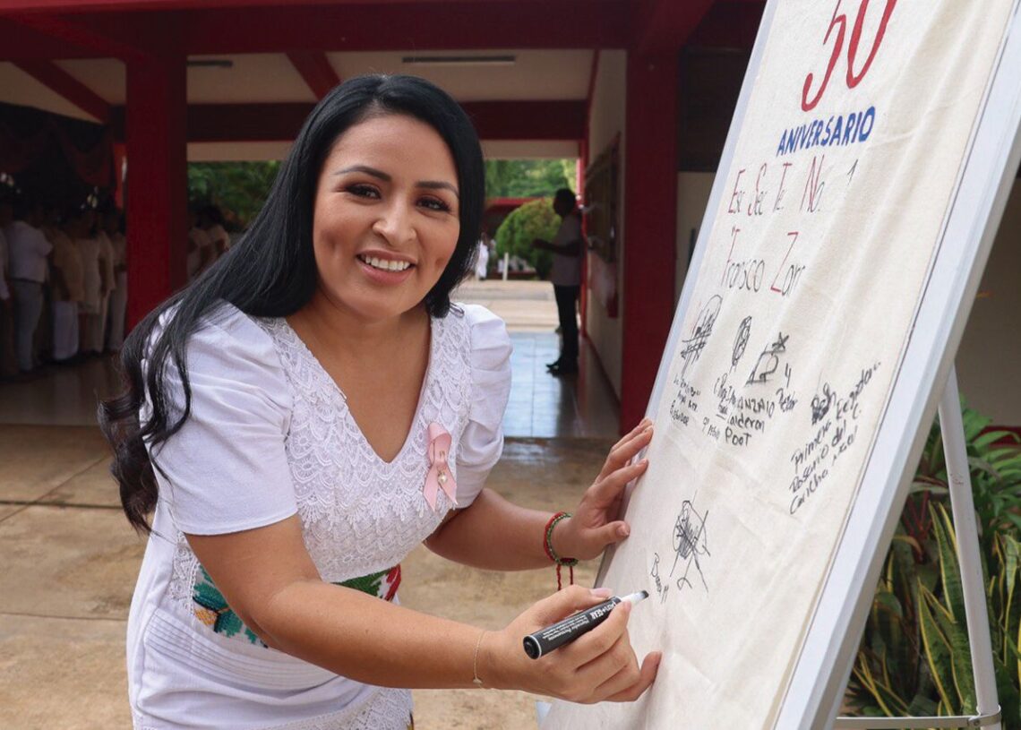 Leona Vicario, Puerto Morelos, Quintana Roo, 11 de octubre.– En el marco de la ceremonia por el cincuentenario de la Secundaria Técnica No. 10 “Francisco Zarco”, la presidenta municipal Blanca Merari Tziu Muñoz reiteró hoy su compromiso de seguir fortaleciendo a la educación mediante el trabajo en equipo.