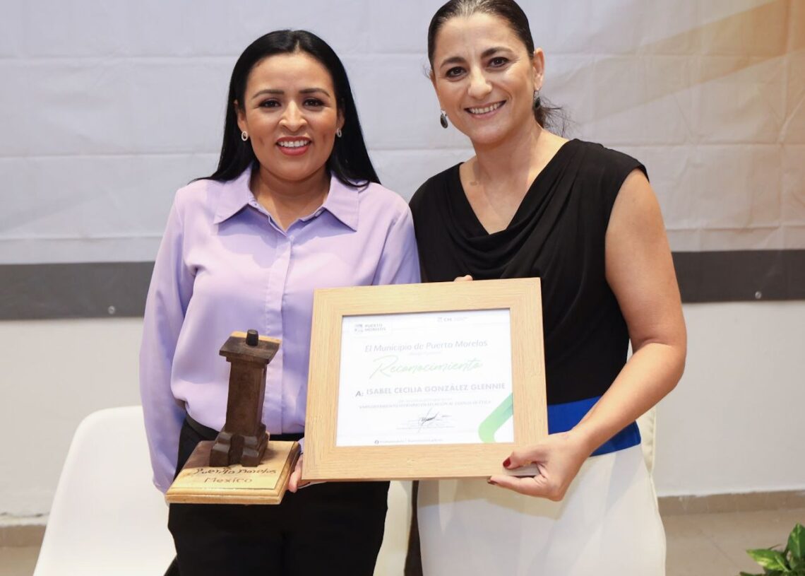 Puerto Morelos, Quintana Roo, 18 de abril de 2023.— La presidenta municipal Blanca Merari Tziu Muñoz entregó hoy un reconocimiento a Isabel Cecilia González Glennie, magistrada titular de la Tercera Sala Unitaria del Tribunal de Justicia Administrativa de Quintana Roo, quien participó en el Simposio “Empoderamiento Femenino en Relación al Código de Ética”.