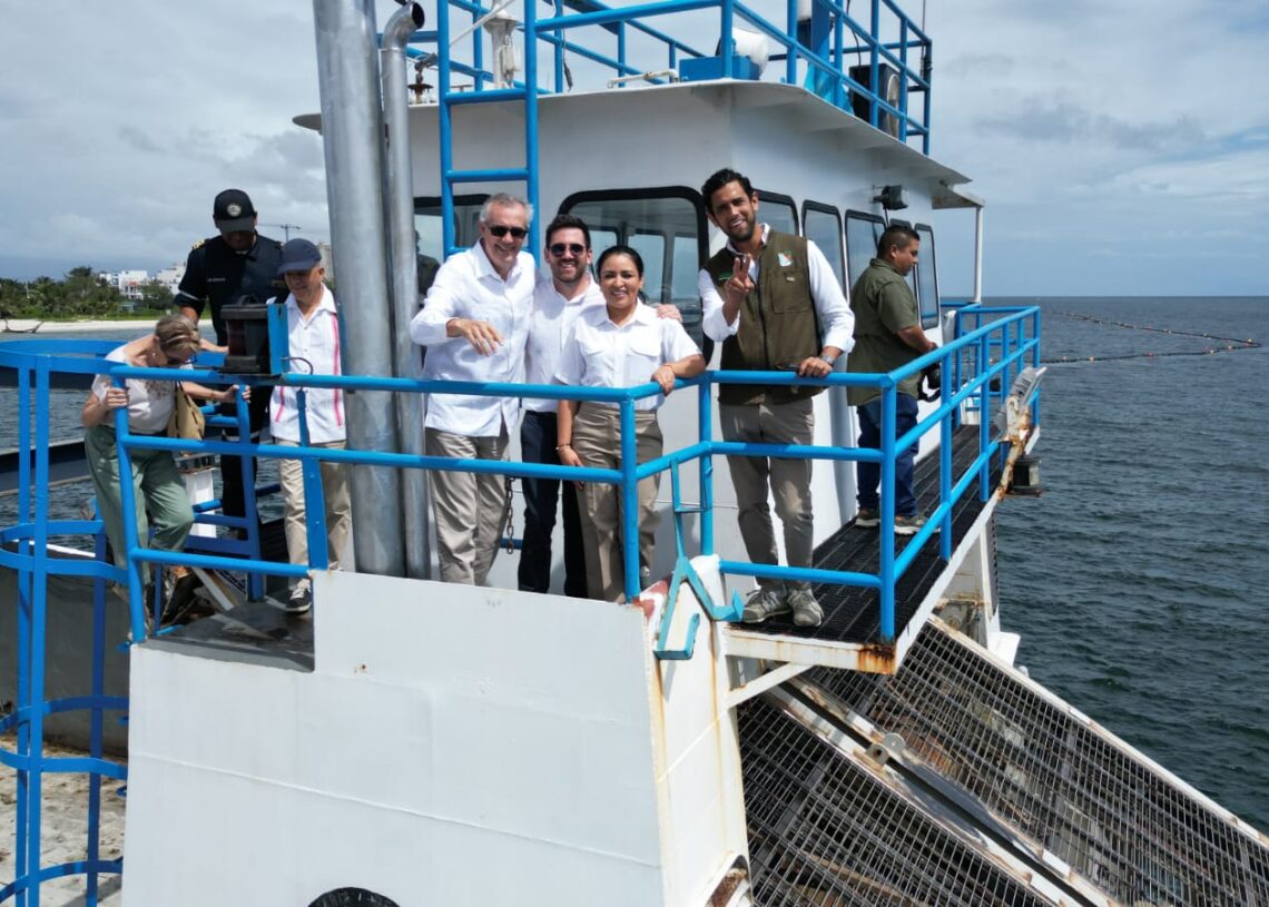 Posteriormente, los visitantes abordaron la barcaza sargacera BSC 210, a bordo de la cual realizaron un breve recorrido para conocer su funcionamiento, al igual que el de las barreras sargaceras instaladas en aguas someras.