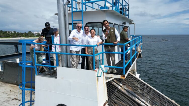 Posteriormente, los visitantes abordaron la barcaza sargacera BSC 210, a bordo de la cual realizaron un breve recorrido para conocer su funcionamiento, al igual que el de las barreras sargaceras instaladas en aguas someras.