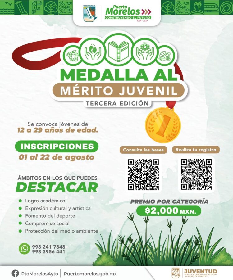 Puerto Morelos, Quintana Roo, 8 de agosto de 2025.— En lo que será el cierre del Mes de la Juventud “Creando Caminos”, el próximo viernes 29 agosto se entregará la Medalla al Mérito Juvenil “Puerto Morelos 2025”, anunció el director general del Instituto Municipal de Juventud, Ernesto León Villanueva García.