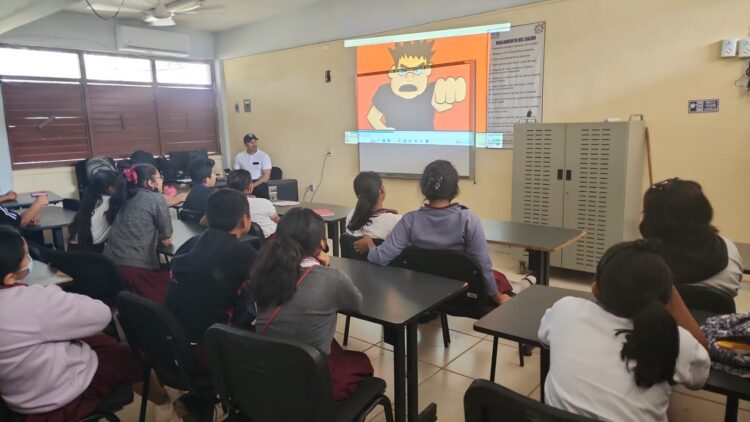 Leona Vicario, Quintana Roo, 27 de febrero de 2023.- Con el objetivo de prevenir casos de “ciberbullying” o acoso cibernético en los planteles educativos del municipio, la Secretaría de Seguridad Pública y Tránsito, en coordinación con la Dirección General de Educación, imparte pláticas a estudiantes de la Escuela Secundaria Técnica número 10, “Francisco Zarco”.