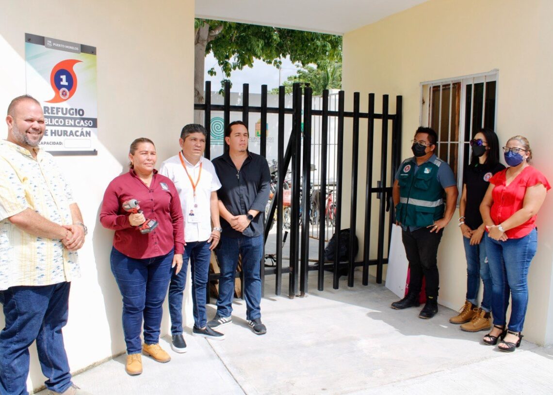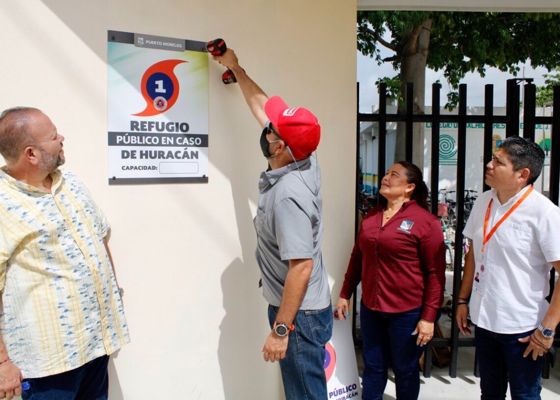 Puerto Morelos, Quintana Roo, 10 de junio de 2022.- Como parte de las acciones encaminadas a proteger a la ciudadanía ante cualquier situación de emergencia durante la actual temporada de huracanes 2022, que arrancó oficialmente el pasado 1 de junio para el océano Atlántico y mar Caribe, autoridades de Puerto Morelos comenzaron hoy con la colocación de nuevos señalamientos en los refugios temporales del municipio.
