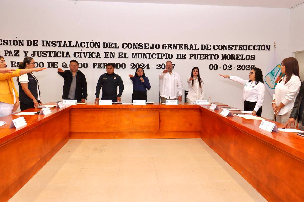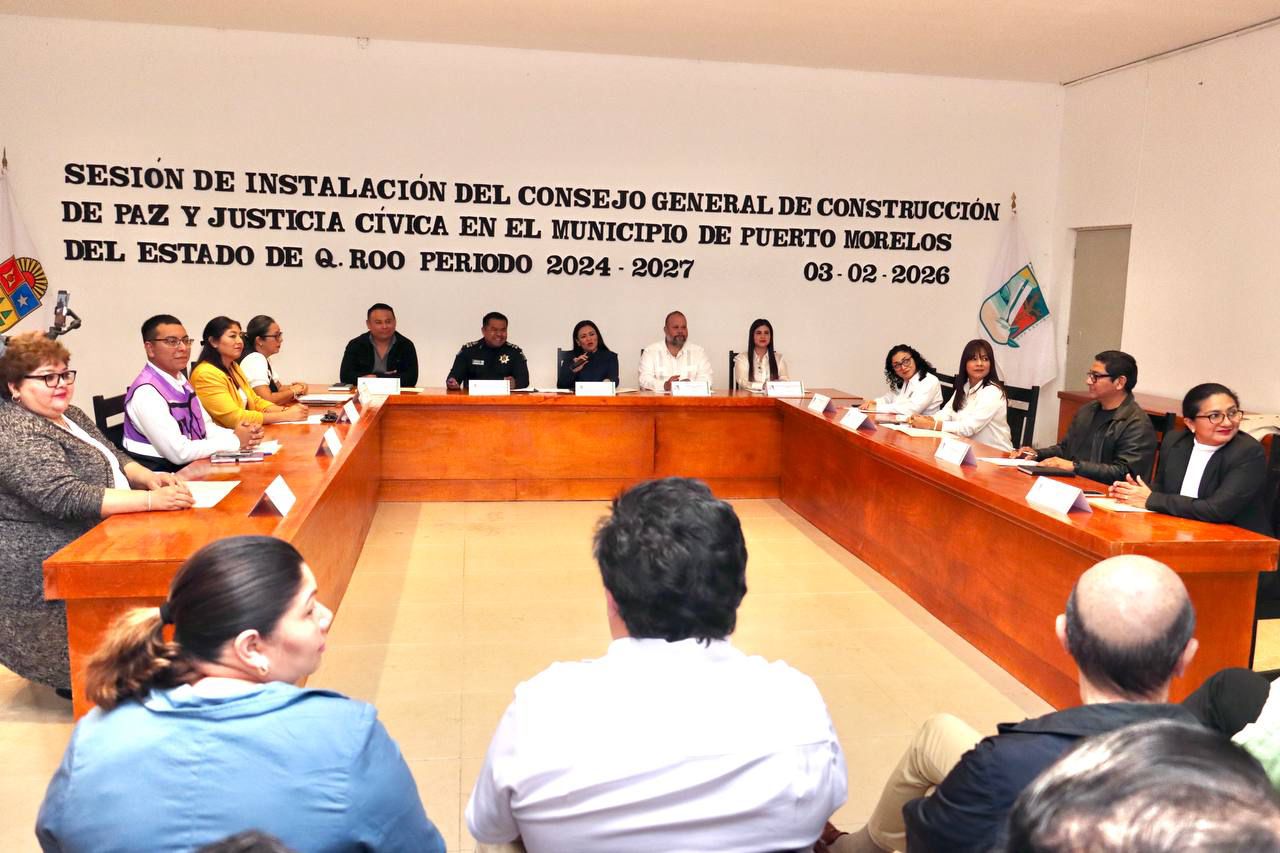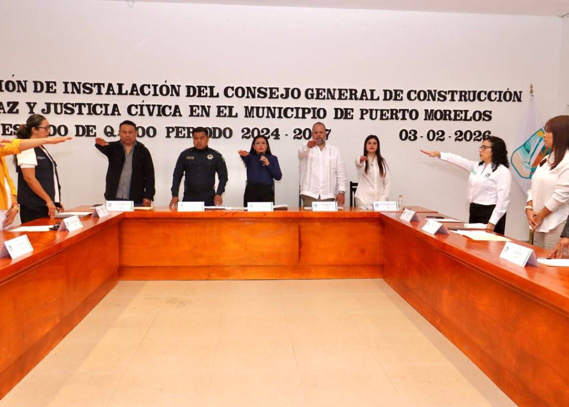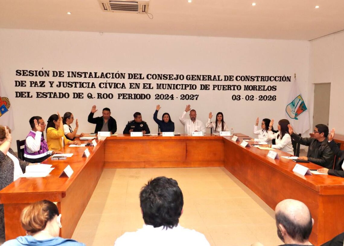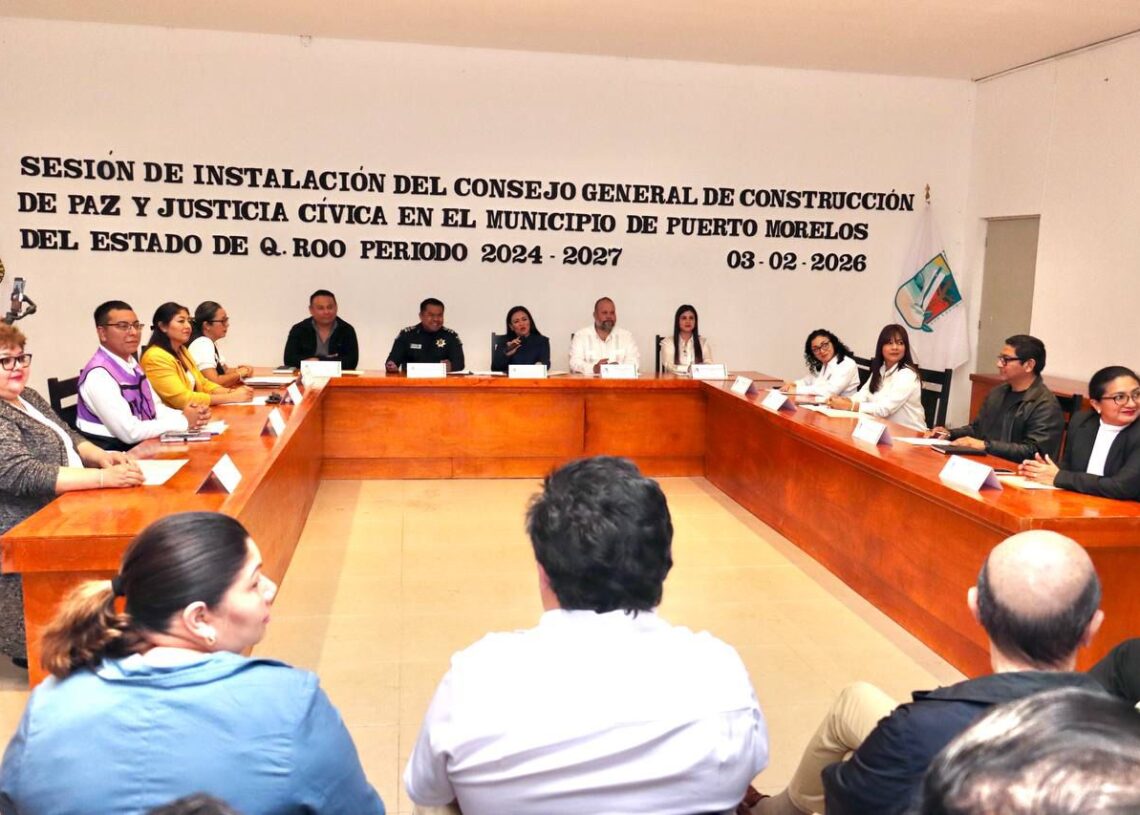 Puerto Morelos, Quintana Roo a 3 de febrero de 2026.— Con el objetivo de fortalecer la reconstrucción del tejido social y consolidar una cultura de paz en el municipio, se llevó a cabo la Sesión de Instalación del Consejo General de Construcción de Paz y Justicia Cívica en el Municipio de Puerto Morelos del Estado de Quintana Roo, periodo 2024-2027.