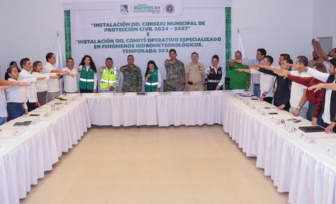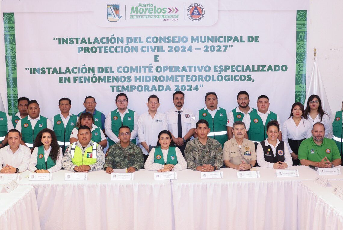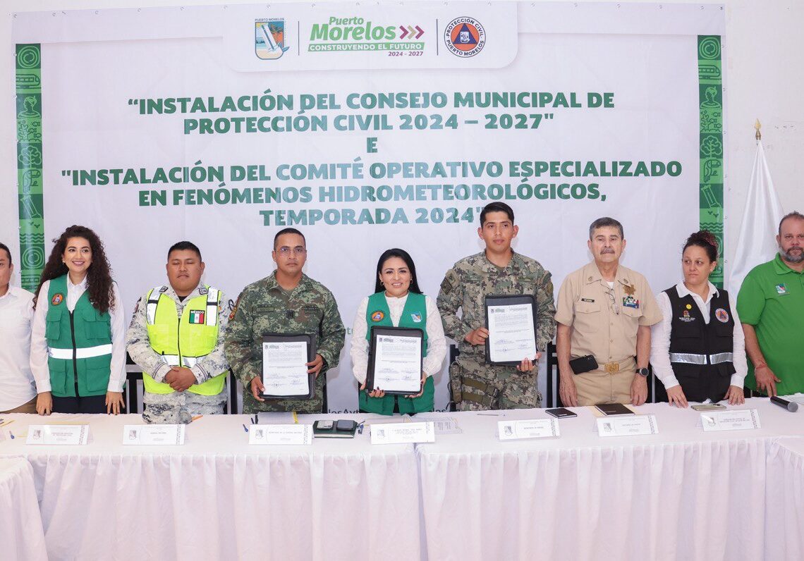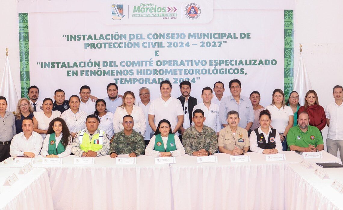 Puerto Morelos, Quintana Roo, 16 de noviembre de 2024.– Autoridades de Puerto Morelos, encabezadas por la presidenta municipal Blanca Merari Tziu Muñoz, instalaron el Consejo Municipal de Protección Civil 2024-2027 y el Comité Especializado en Fenómenos Hidrometeorológicos Temporada 2024, en la Sala de Cabildo del Palacio Municipal.