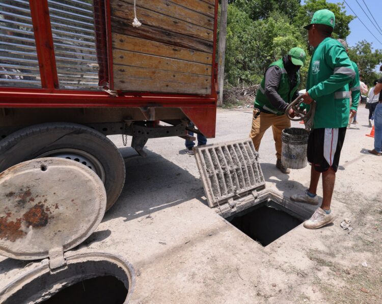 Posteriormente, sobre la avenida Timón, la Presidenta Municipal verificó la limpieza de pozos de absorción, labor que se realiza de forma manual o con maquinaria para retirar los lodos y garantizar un flujo adecuado del agua durante la temporada de lluvias, evitando encharcamientos.