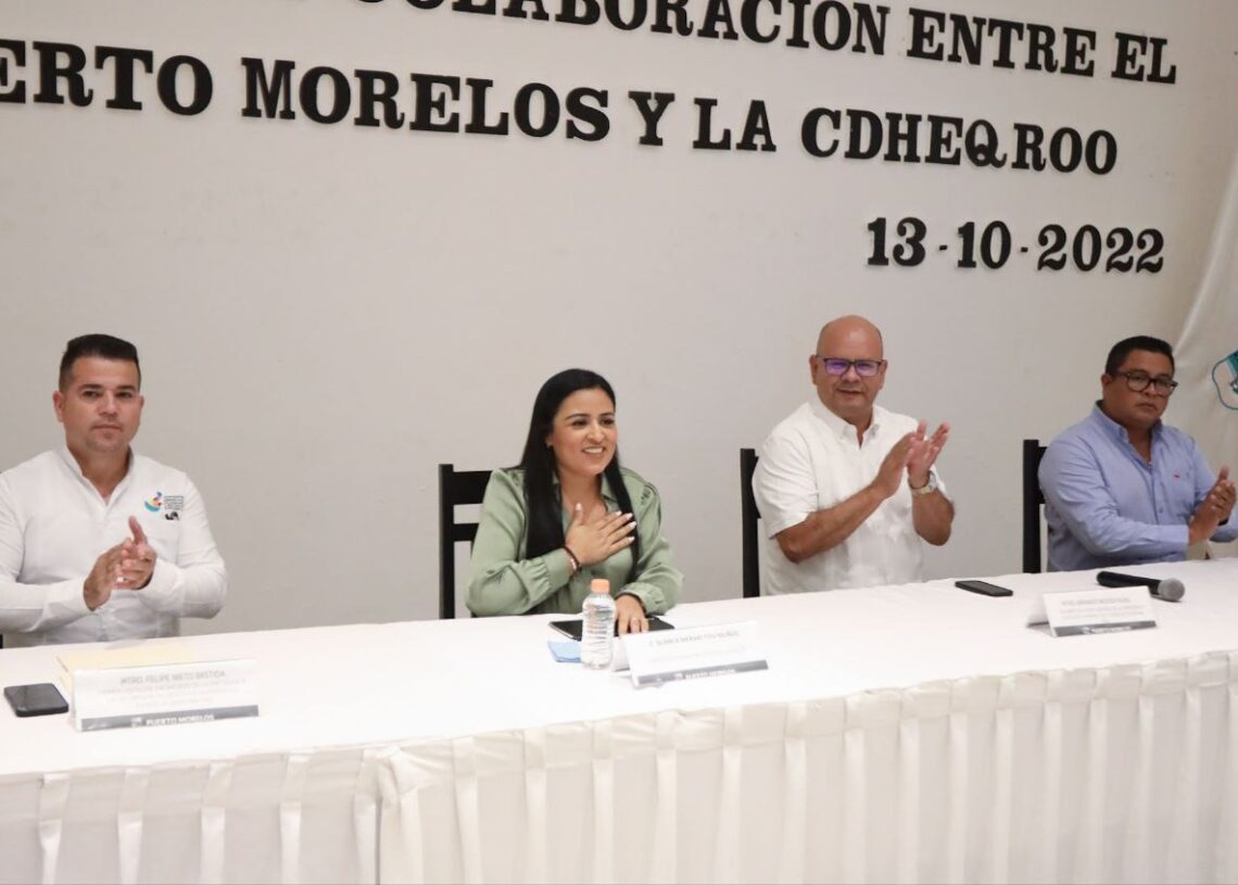 Puerto Morelos, Quintana Roo, 13 de octubre de 2022.— La presidenta municipal Blanca Merari Tziu Muñoz firmó hoy con Felipe Nieto Bastida, primer visitador y encargado de la presidencia de la Comisión de Derechos Humanos del Estado de Quintana Roo (Cdheqroo), un convenio de colaboración para fortalecer la cultura de los derechos humanos.