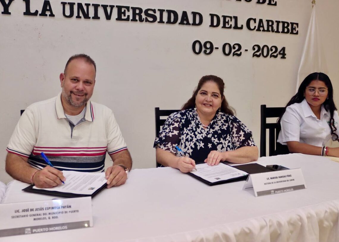 Puerto Morelos, Quintana Roo, 9 de febrero de 2024.— El secretario general del Ayuntamiento, José de Jesús Espinosa Payán, y la rectora de la Universidad del Caribe, (Unicaribe), Marisol Vanegas Pérez, firmaron hoy un convenio que contribuirá al crecimiento profesional de los servidores públicos municipales, quienes accederán a licenciaturas, diplomados, cursos de capacitación e idiomas que ofrece la casa de estudios.
