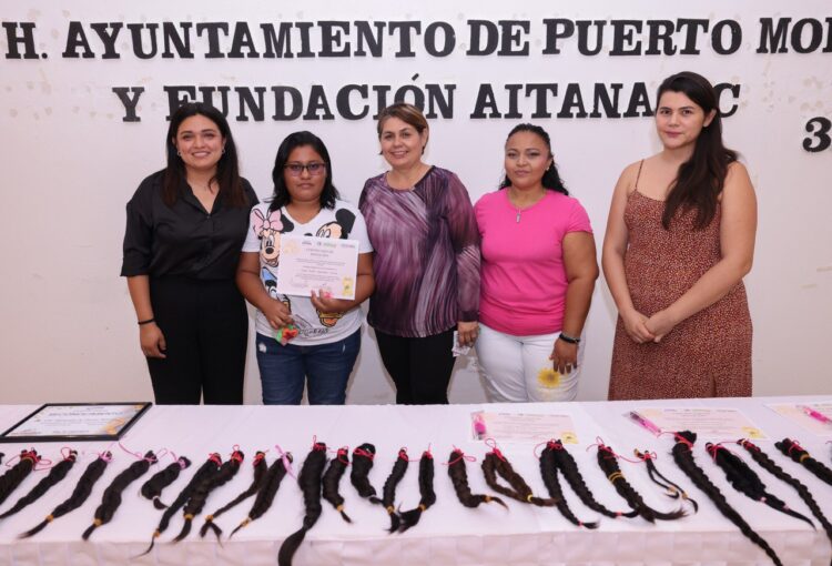 La presidenta municipal entregó 42 trenzas recolectadas en la campaña de donación de cabello organizada por el DIF Puerto Morelos, en el marco de la jornada “Alas de Esperanza”, destinada a recaudar fondos para tratamientos, alimentación y traslados de niñas, niños y familias que enfrentan el cáncer.