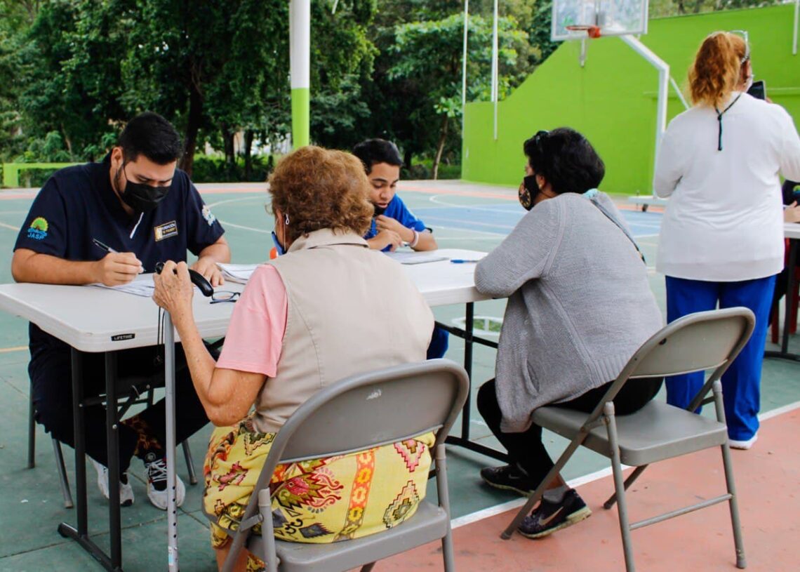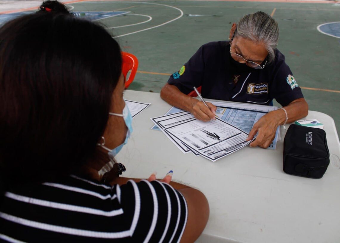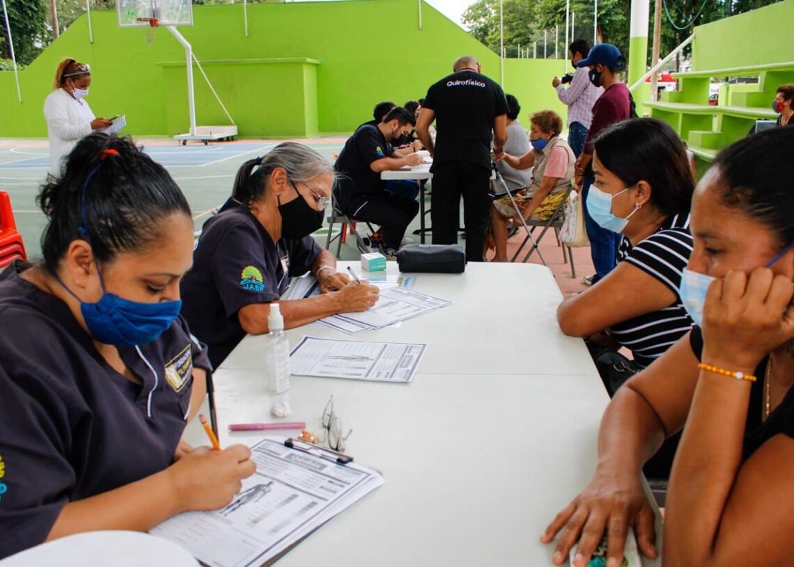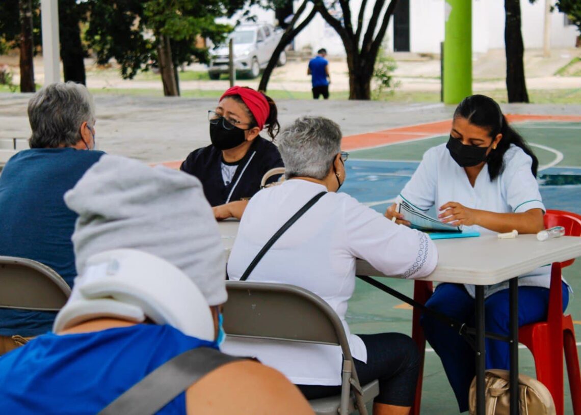 Puerto Morelos, Quintana Roo, 28 de enero de 2022.— La presidenta honoraria del Sistema DIF de Puerto Morelos, Maura Cordero Silva, y la Fundación Si Palmer llevaron a cabo, en el domo deportivo de la colonia Zetina Gasca, la valoración de personas de la tercera edad que requieren terapias quirofísicas.