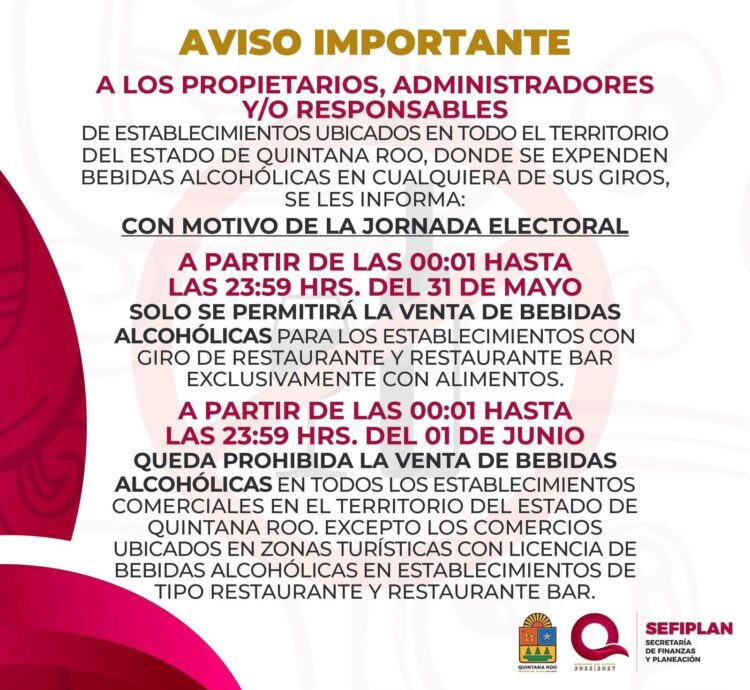 *El gobierno de Puerto Morelos atento al acuerdo emitido por la Secretaría de Finanzas y Planeación (Sefiplan) de Quintana Roo para evitar la venta de bebidas alcohólicas desde el primer minuto y hasta las 23:59 del domingo 1 de junio del año en curso